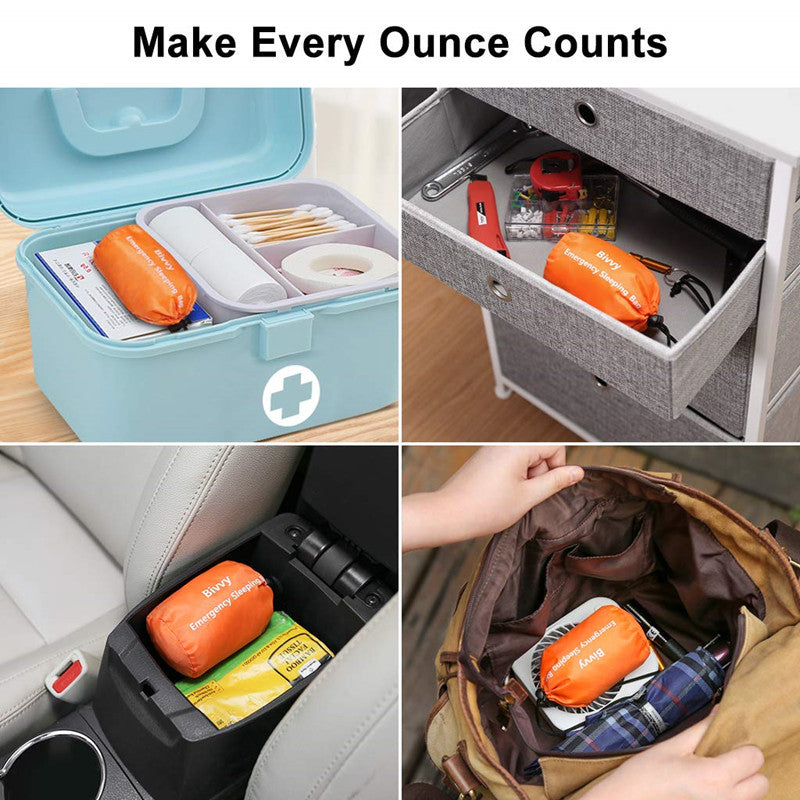 This survival gear is small enough to fit in the palm of your hand,easy to carry and store at anytime and anywhere.Our life emergency bivvy are a must-have for outdoor,camping, trail running, marathons, bug out bag, car survival kit, earthquake survival kits,survival gear,hiking bag and travel first aid kit